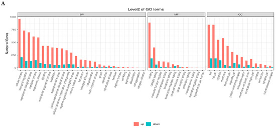 (A–D) Gene Ontology (GO) enrichment analysis of differentially expressed genes (DEGs) across four follicular stages, PRF, PMF, SWF, and SYF in chicken ovaries, contrasting low- and high-egg-laying hens. The bar plots illustrate the distribution of upregulated (red) and downregulated (blue) differentially expressed genes (DEGs) across the three primary Gene Ontology (GO) domains: biological process (BP), molecular function (MF), and cellular component (CC). Each subplot depicts the principal GO terms enriched within the appropriate domain, with counts reflecting the number of DEGs linked to each phrase. These comparison profiles show significant changes in gene regulatory activity, implying essential biological processes and pathways associated with follicular growth and their possible influence on egg-laying ability.