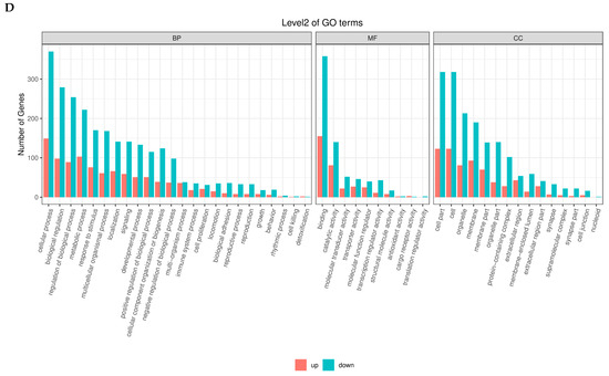 The ClusterProfiler package in R (R 4.5.2) was used to perform functional enrichment analysis of differentially expressed genes (DEGs). Gene Ontology (GO) terms are classified into three primary categories: biological processes (BP), molecular functions (MF), and cellular components (CC). The Kyoto Encyclopedia of Genes and Genomes (KEGG) analysis indicated enriched pathways during follicular transitions. Significance was evaluated using a Benjamini–Hochberg-adjusted p-value threshold of <0.05. The enrichment results were illustrated using bar plots, distinguishing between upregulated (red) and downregulated (blue) gene categories across developmental stages.