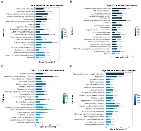 (A–D) KEGG pathway enrichment analysis was conducted on differentially expressed genes (DEGs) across four stages of follicular development—PR, PM, SW, and SYF—in chicken ovaries, comparing high- and low-egg-laying hens. The bar charts depict the top 20 significantly enriched pathways, ordered by gene percentage and differentiated by adjusted q-value colour coding. Enriched pathways across stages encompass immune response mechanisms, such as cytokine–cytokine receptor interactions and antigen processing and presentation; cell communication processes, including ECM–receptor interactions and focal adhesion; and metabolic pathways, notably arachidonic acid and sphingolipid metabolism. The differences in pathway enrichment across follicular stages demonstrate stage-specific transcriptional dynamics, highlighting the importance of immune signaling, metabolic regulation, and intercellular signaling pathways in follicle development and egg production potential in hens.