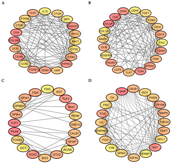 (A–D) The protein–protein interaction (PPI) networks of differentially expressed genes across four follicular groups were constructed utilising STRING and visualised through Cytoscape 3.10.3: (A) includes key genes like FOXO3, IL15, and CD4, which are implicated in immune regulation and stress response; (B) identifies TGFB1, CD44, and COL3A1, indicating their roles in cell adhesion and the organization of the extracellular matrix; (C) includes TCF4, TCF7, WNT1, and SOX2, indicating active Wnt signaling and transcriptional regulation; (D) includes hub genes such as CYP19A1, FGF7, and SST, which have essential roles in hormone biosynthesis and local growth factor activity, highlighting the dynamic regulatory mechanisms present in low and high egg-laying hens.