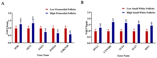 RT-qPCR analysis was conducted on selected genes across four follicle types—PR, pPM, SW, and SYF—to validate the transcriptome data and investigate key regulatory pathways related to follicular development in low- and high-egg-laying hens. In PRF, genes associated with the PI3K-AKT signaling pathway, such as PI3K, AKT1, PTEN, FOXO3, and CDKN1B, exhibited significantly elevated expression levels in low-egg-laying hens relative to high-egg-laying hens, indicating a potential inhibitory function in the activation of early follicles. In PMF, components of the TGF-β pathway, such as MYC, SMAD2, SMAD4, TGFBR2, and TGFB1, exhibited upregulation in low-egg-laying hens, suggesting a modification in the regulation of early follicular growth. Conversely, genes associated with the WNT signaling pathway, including DLL1, CTNNB1, TCF4, TCF7, and MYC, exhibited significant upregulation in the SWF of high-egg-laying hens, indicating increased WNT activity during this transitional phase. SYF from high-egg-laying hens exhibited increased expression of key steroidogenic genes, including FSHR, CYP19A1, HSD17B1, and CYP11B1, which aligns with the enhanced steroidogenic capacity necessary for follicle selection and maturation. The observed expression patterns reveal distinct pathway activation profiles at various stages of folliculogenesis, which may explain the reproductive performance disparities between low- and high-egg-laying hens (Figure 7A–D).