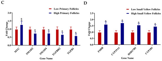 (A–D) Relative mRNA expression levels for specific genes associated with key regulatory pathways were examined in (A) PRF, (B) PMF, (C) SWF, and (D) SYF. Each panel contrasts gene expression between low (red bars) and high (blue bars) egg-laying hens. Genes linked to the PI3K-AKT, TGF-β, WNT, and steroidogenesis pathways exhibited notable differential expression throughout follicle stages. Expression values were set against internal controls, normalised to internal controls, and presented as fold change (mean ± SEM). Asterisks (*) denote statistically significant differences between groups (* p < 0.05; ** p < 0.01).