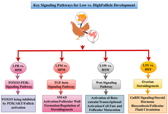 The PI3K-AKT-FOXO3, TGF-β, Wnt, and ovarian steroidogenesis pathways form a cohesive regulatory network that regulates follicular activation, granulosa cell proliferation, and hormonal responsiveness in hens exhibiting varying egg-laying capacities. The PI3K-AKT-FOXO3 axis triggers the activation of primordial follicles by influencing cell survival and the dormancy of oocytes. In contrast, TGF-β signaling regulates the proliferation of granulosa cells via SMAD-dependent transcriptional mechanisms. Simultaneously, the Wnt/β-catenin pathway enhances signals for proliferation and differentiation, working in conjunction with both PI3K-AKT and TGF-β signaling to support follicular transition and growth. Following these molecular pathways, ovarian steroidogenesis converts intracellular signaling into hormonal outputs that govern follicle selection and ovulation. The interactions among these pathways create a molecular continuum—from follicular activation to steroid-driven maturation—that explains the enhanced reproductive performance of high-egg-laying hens. Gaining insights into these integrated networks is crucial for enhancing genetic selection, reproductive management, and overall productivity in poultry.