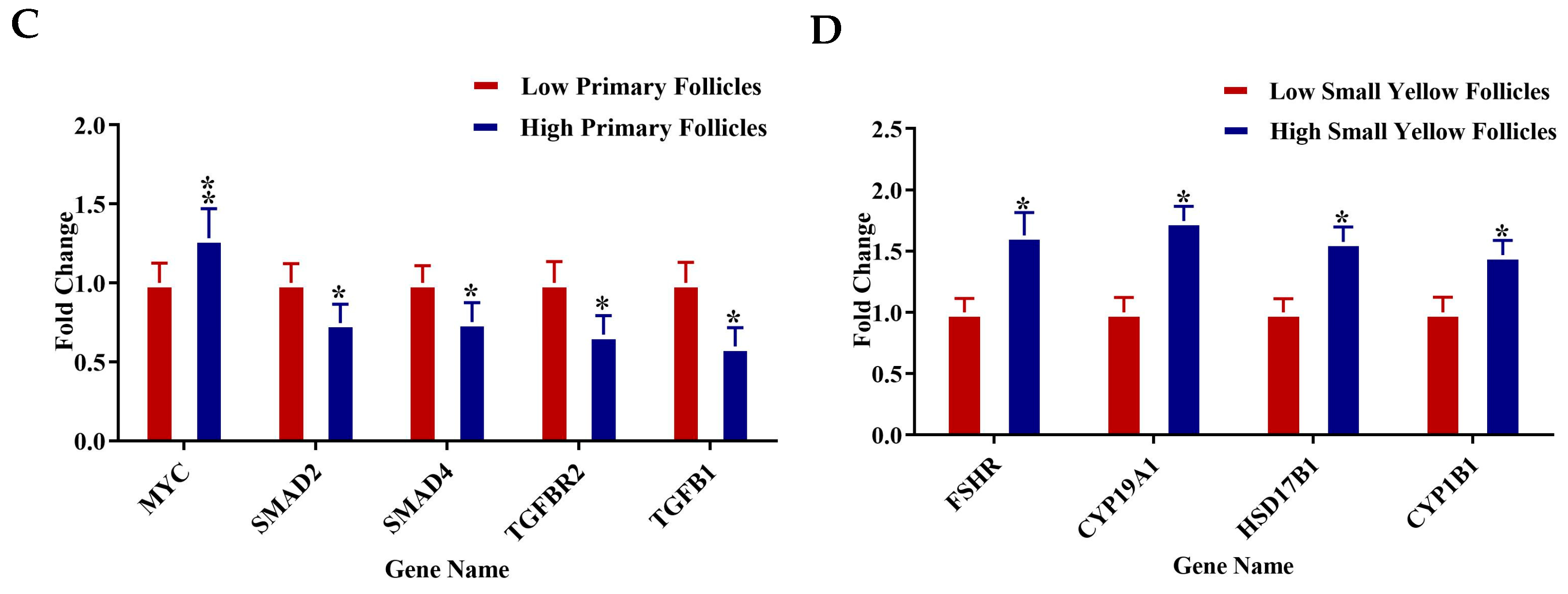 - Bonnet, A.; Servin, B.; Mulsant, P.; Mandon-Pepin, B. Spatio-temporal gene expression profiling during in vivo early ovarian folliculogenesis: Integrated transcriptomic study and molecular signature of early follicular growth. PLoS ONE 2015, 10, e0141482. [Google Scholar] [CrossRef]