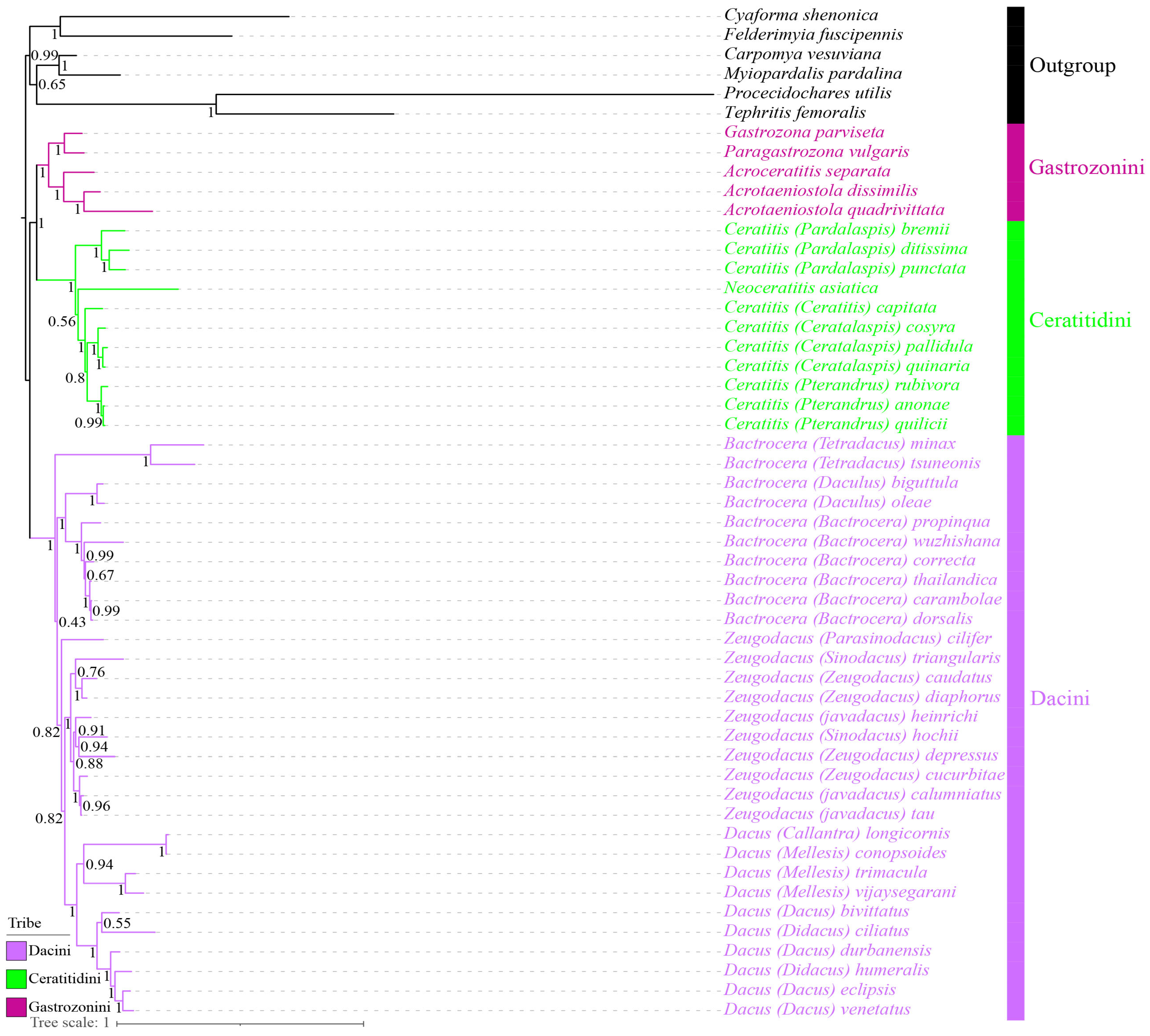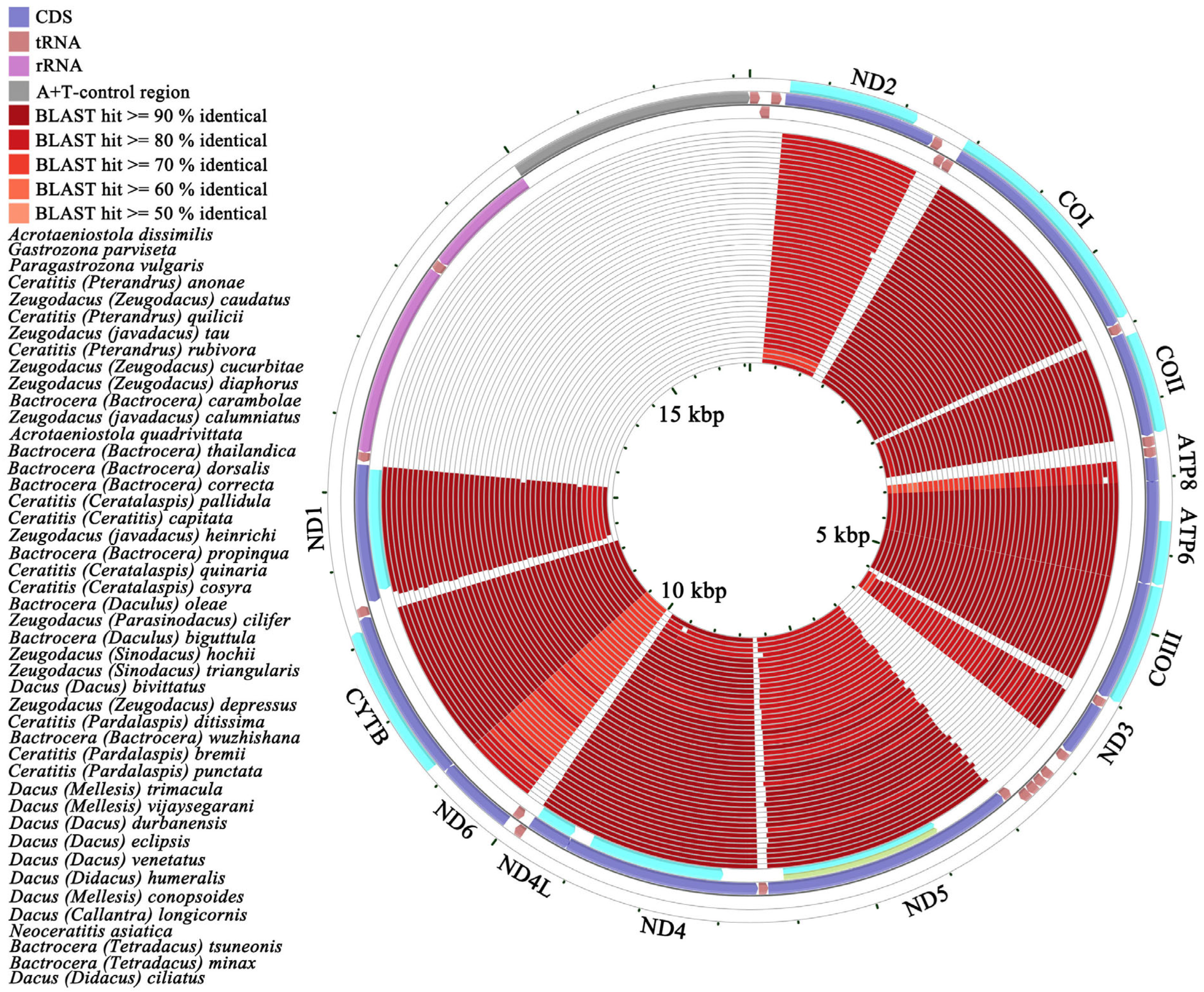 - Jiang, F.; Pan, X.B.; Li, X.K.; Yu, Y.X.; Zhang, J.H.; Jiang, H.S.; Dou, L.D.; Zhu, S.F. The first complete mitochondrial genome of Dacus longicornis (Diptera: Tephritidae) using next-generation sequencing and mitochondrial genome phylogeny of Dacini tribe. Sci. Rep. 2016, 6, 36426. [Google Scholar] [CrossRef] [PubMed]