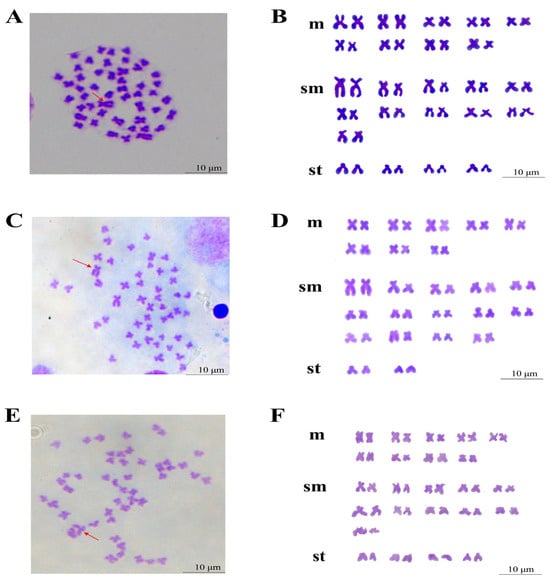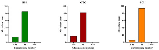The results indicated that 85% of BSB cells had 48 chromosomes, following a karyotype formula of 18m + 22sm + 8st (Figure 4A,B). In 82% of GTC cells, there were 48 chromosomes in the division phase, with a karyotype formula of 16m + 28sm + 4st (Figure 4C,D). In 94% of BG cells, there were 48 chromosomes in the division phase, with a karyotype formula of 18m + 22sm + 8st (Figure 4E,F). The chromosome number and karyotype of BG were identical to those of BSB.