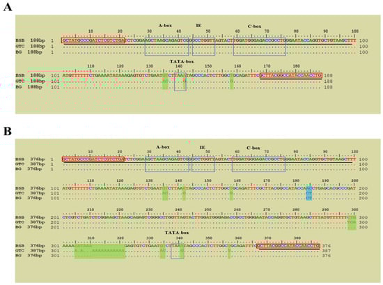 In this study, each 5S rDNA molecule consists of two coding regions (5′-99 bp and 3′-21 bp) separated by an NTS sequence. The NTS sequence of the 188 bp 5S rDNA fragment in BG and BSB was identical, while it differed from that of GTC at positions 135, 136, 143, and 153 (Figure 5A). For the 376 bp 5S rDNA fragment, the NTS sequences in BG and BSB differed at positions 184 and 185, but these positions were identical to those in GTC. However, the 376 bp 5S rDNA NTS sequence in BG and GTC showed differences at multiple positions (Figure 5B).