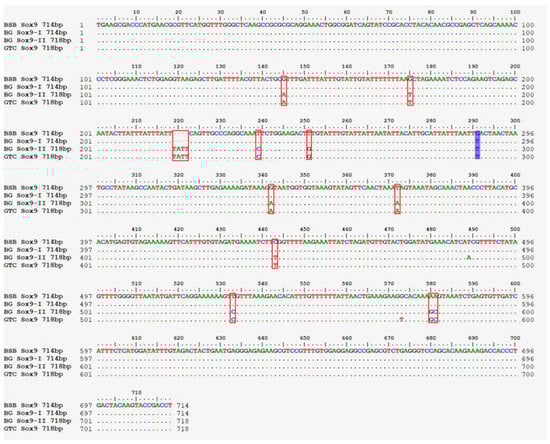 The nucleotide sequence alignment of Sox9 gene fragments in BSB, GTC, and BG. Nucleotide sequence alignment of Sox9 gene fragments in BSB (714 bp), GTC (718 bp), BG-I (714 bp), and BG-II (718 bp). The dark purple shadow boxes indicate the bases that are identical in BSB, GTC, and BG. The red boxes indicate the bases with identical sequences in BG and GTC. Note: n = 20 per group.