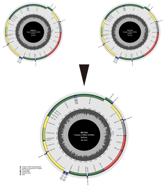 The results of the assembly and annotation revealed that the complete mitochondrial genome sequences were 16,623 bp for BSB, 16,620 bp for GTC, and 16,623 bp for BG (Figure 7).