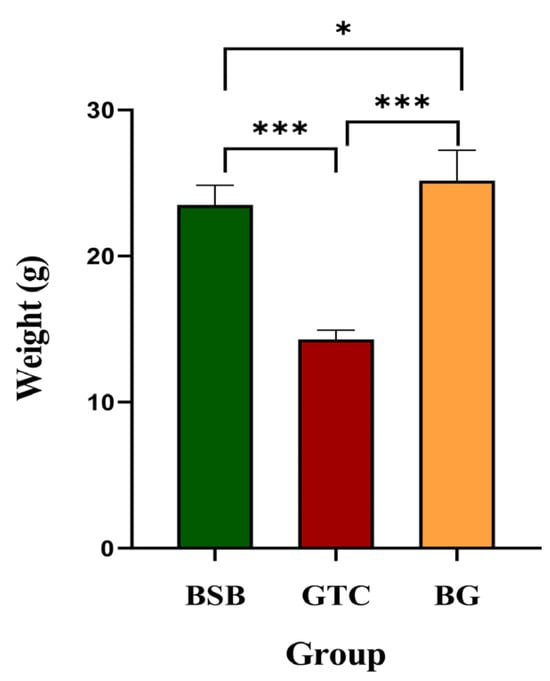 The differences in body weight among 6-month-old BSB, GTC, and BG. “*” indicates a significant difference, * p < 0.05, *** p < 0.001. Note: n = 20 per group.