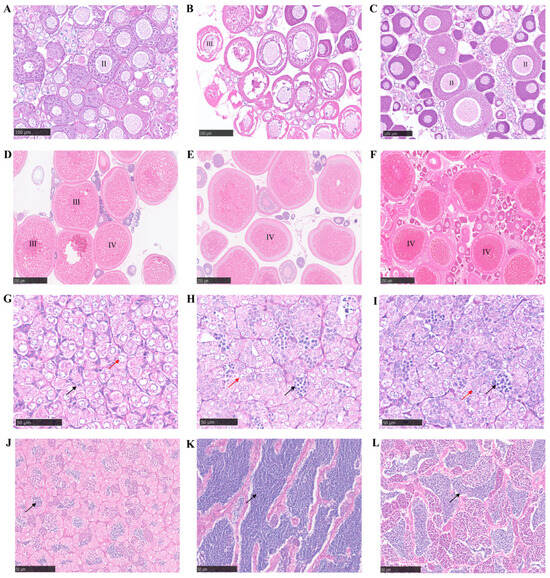 The gonadal microstructure of 6- and 15-month-old BSB, GTC, and BG. (A) Ovary of a 6-month-old BSB female with oocytes at stage II. (B) Ovary of a 6-month-old GTC female with oocytes at stage III. (C) Well-developed ovary of a 6-month-old BG female with oocytes at stage II. (D) Ovary of a 15-month-old BSB female with oocytes at stages III and IV. (E) Ovary of a 15-month-old GTC female predominantly with oocytes at stage IV. (F) Ovary of a 15-month-old BG female with abundant oocytes at stage IV. (G) Testis of a 6-month-old BSB male with few spermatids. (H) Testis of a 6-month-old GTC male with numerous spermatids. (I) Testis of a 6-month-old BG male with abundant spermatids. (J) Testis of a 15-month-old BSB male with a few mature spermatozoa. (K) Seminiferous tubules of a 15-month-old GTC male testis filled with mature spermatozoa. (L) Seminiferous tubules of a 15-month-old BG male testis with abundant mature spermatozoa. Red arrows: spermatogonia; black arrows: spermatids. Note: n = 20 per group.