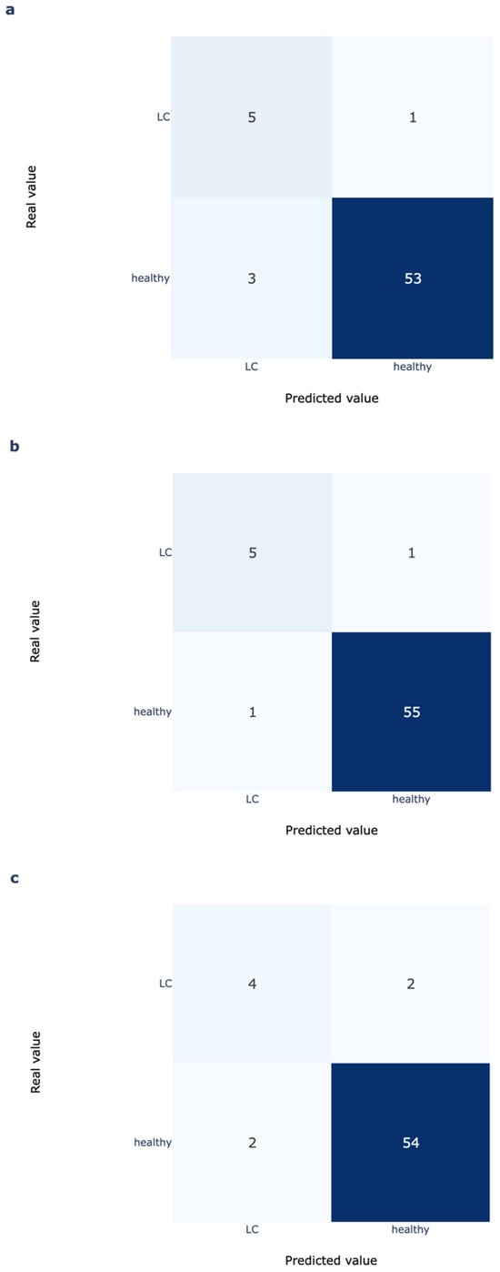Confusion matrices for DL Model with threshold 0.75 (a) and 0.9 (b) until 2 h postpartum and RT model at day −1 day antepartum (c).