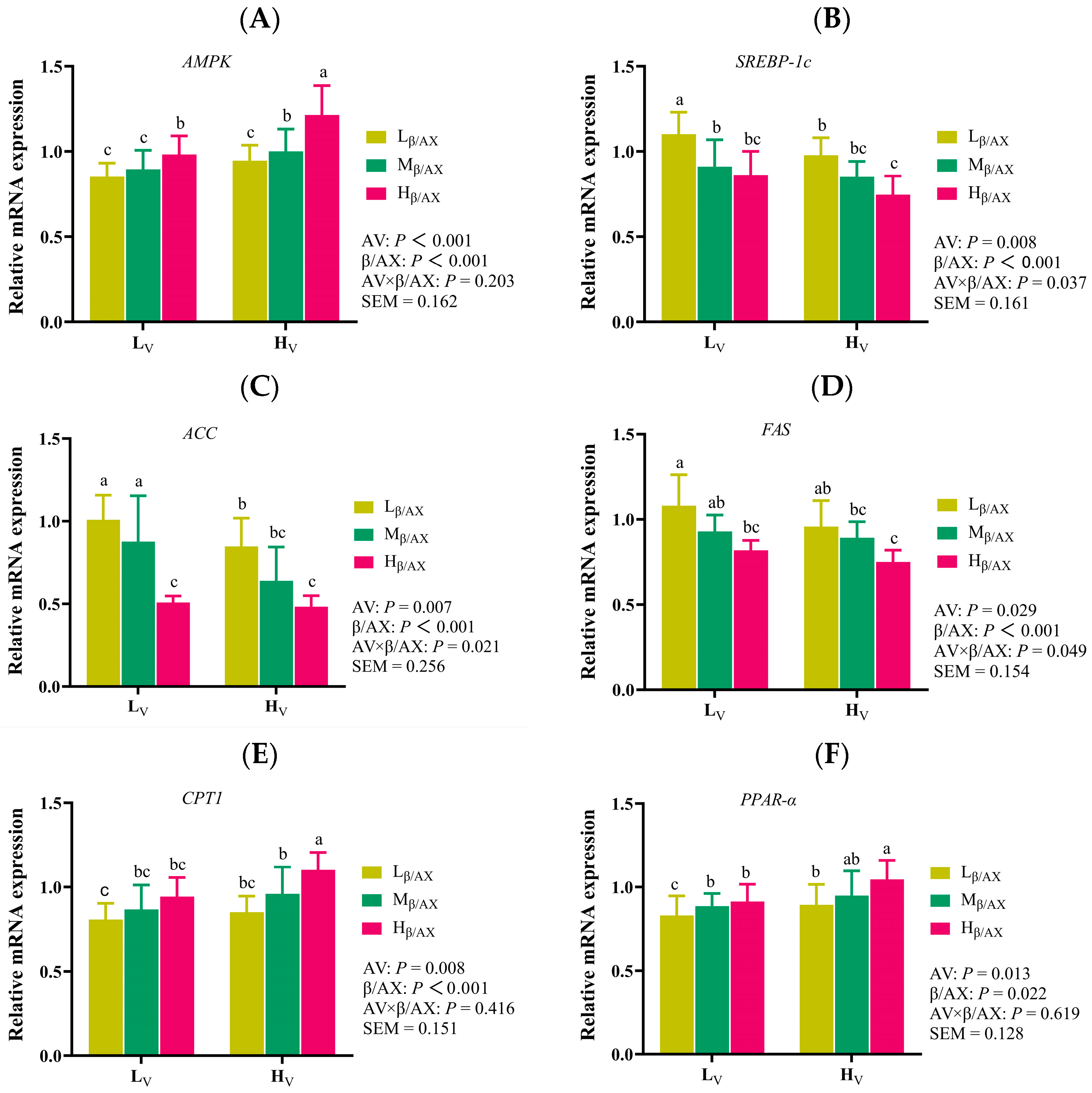 ACC, were notably reduced in the group receiving high dietary β/AX and AV. These results corroborate previous findings in pig liver, muscle, and adipose tissues [