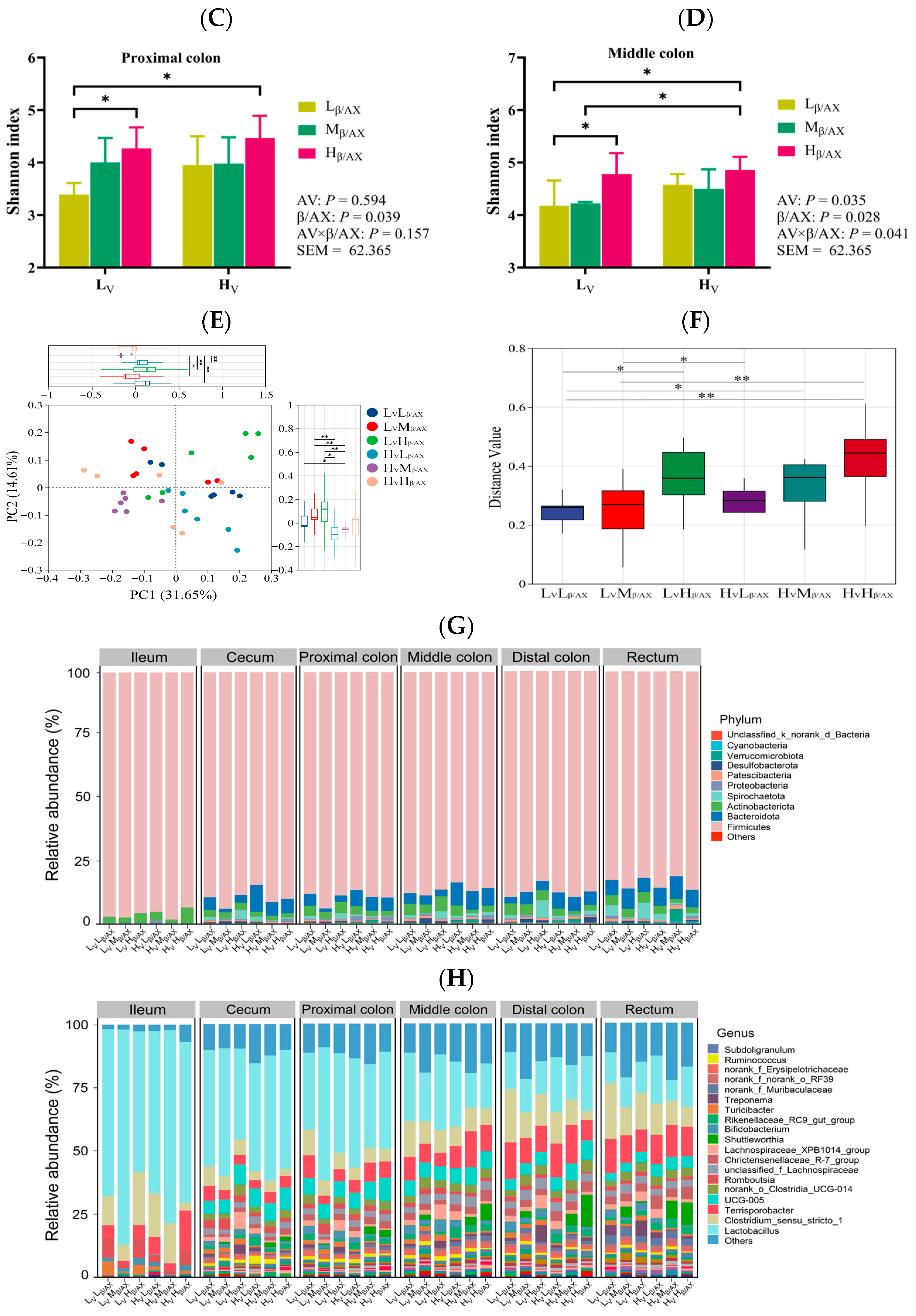 48]. Building on these findings, our study explores the mechanisms by which dietary β/AX and AV influence fat deposition in pigs, mediated by the gut-liver axis effect, which is contingent upon the physicochemical characteristics of DF. Through the analysis of alpha and beta diversities across different groups, our research has identified significant variations in the microbial community structures across various segments of the digestive tract, including the ileum, cecum, proximal colon, middle colon, distal colon, and rectum. Notably, the microbial communities in the middle colon are crucially influenced by the chemical structure and physical characteristics of the DF. Our findings indicate that adjusting the levels of dietary β/AX and AV selectively enhances the relative abundance of acid-producing bacterial genera such as