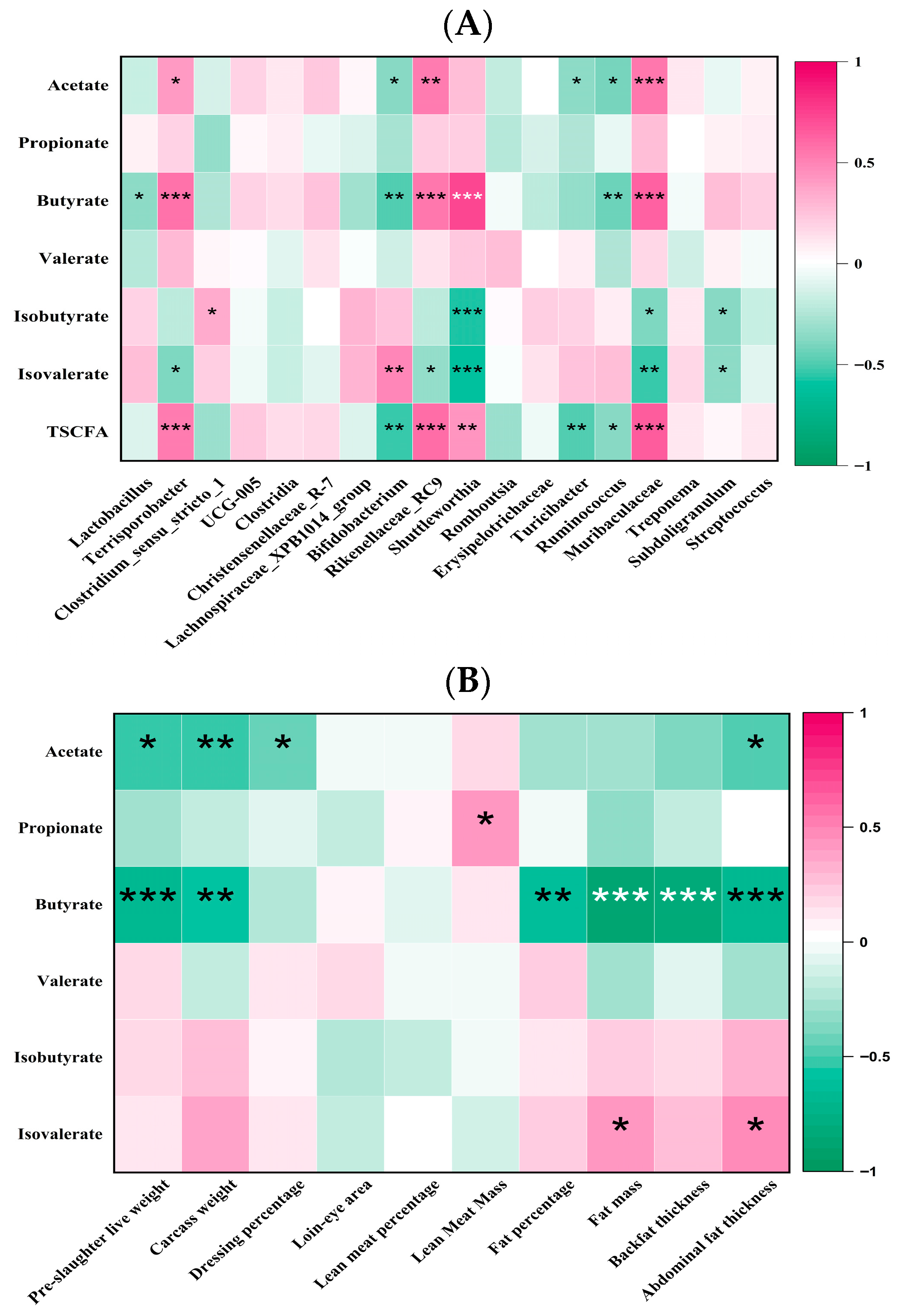 56] demonstrated that supplementation with a combination of acetic acid, propionic acid, and butyric acid reduces fat deposition in pigs, regardless of the involvement of the gut microbiota. In a recent investigation, the augmentation of β/AX and AV in pig diets was found to synergistically enhance butyrate production, which in turn increased the absorption of butyric acid, as evidenced by a significant elevation in butyrate concentrations in the hepatic portal vein plasma [