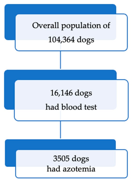 Azotemia, characterized by an increased concentration of nonprotein nitrogenous compounds such as blood urea nitrogen (BUN) and serum creatinine (SCr), is a key biochemical indicator of impaired kidney function in dogs [,]. Azotemia was defined as BUN ≥ 28 mg/dL and/or SCr > 1.7 mg/dL. Clinically, azotemic dogs may present with nonspecific signs such as lethargy, anorexia, vomiting, polyuria, polydipsia, and dehydration, reflecting accumulation of metabolic waste and altered fluid balance. Depending on the underlying cause, azotemia can be classified as prerenal, resulting from a simultaneous decrease in glomerular filtration rate induced by volume depletion, vascular collapse, thrombotic diseases, and shock. The occurrence of renal azotemia is predisposed by nephrons’ destruction by toxins, infectious agents, inflammatory, ischemic, or neoplastic processes. In comparison, postrenal azotemia plays a different role due to obstruction of the urinary tract. It impairs the elimination of waste products in urine, leading to fluid, electrolyte, and acid-base imbalances. Nonetheless, intrinsic renal parenchyma injury can be affected by pre- and postrenal azotemia [,].