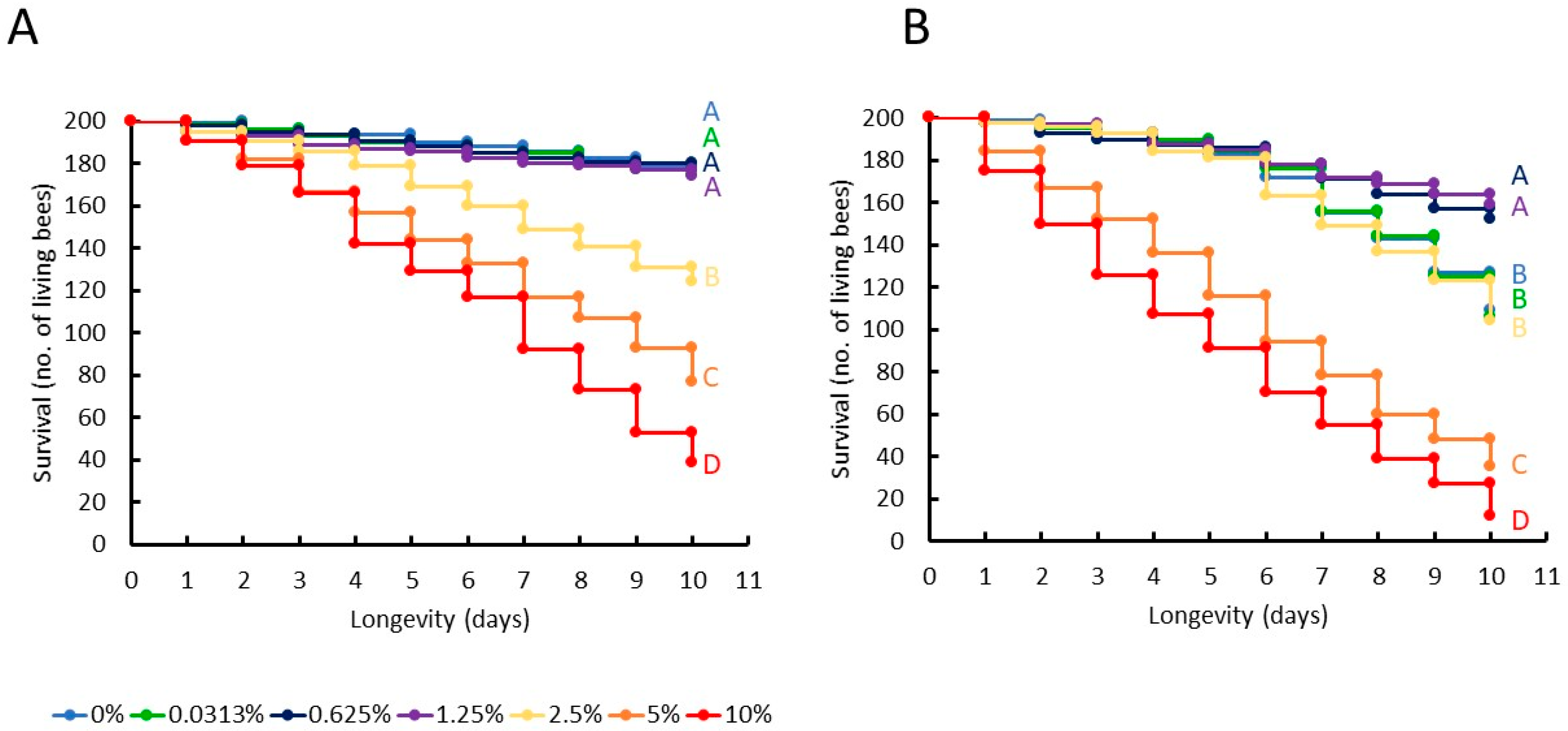 - Ostap-Chec, M.; Bajorek, D.; Antoł, W.; Stec, D.; Miler, K. Occasional and Constant Exposure to Dietary Ethanol Shortens the Lifespan of Worker Honey Bees. J. Comp. Physiol. B 2024, 194, 403–410. [Google Scholar] [CrossRef]