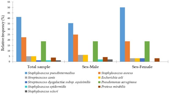 In the present study, the bacterial species most commonly associated with canine otitis externa was S. pseudintermedius (41%), followed by S. aureus (23%) and P. aeruginosa (19%). Less common isolates comprised E. coli (n = 4), S. canis (n = 4), P. mirabilis (n = 3), besides single occurrences of other bacterial species. Figure 2 illustrates the relative frequencies of female and male dogs according to the bacterial etiology of otitis externa.