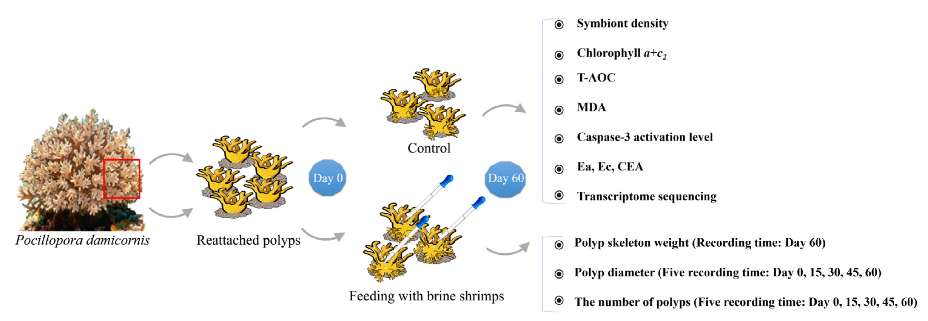 - Lam, K.W.; McRae, C.J.; Liu, Z.T.; Zhang, X.C.; Fan, T.Y. Effective Techniques for the Feeding and Ex Situ Culture of a Brooding Scleractinian Coral, Pocillopora acuta. J. Vis. Exp. 2023. [Google Scholar] [CrossRef]