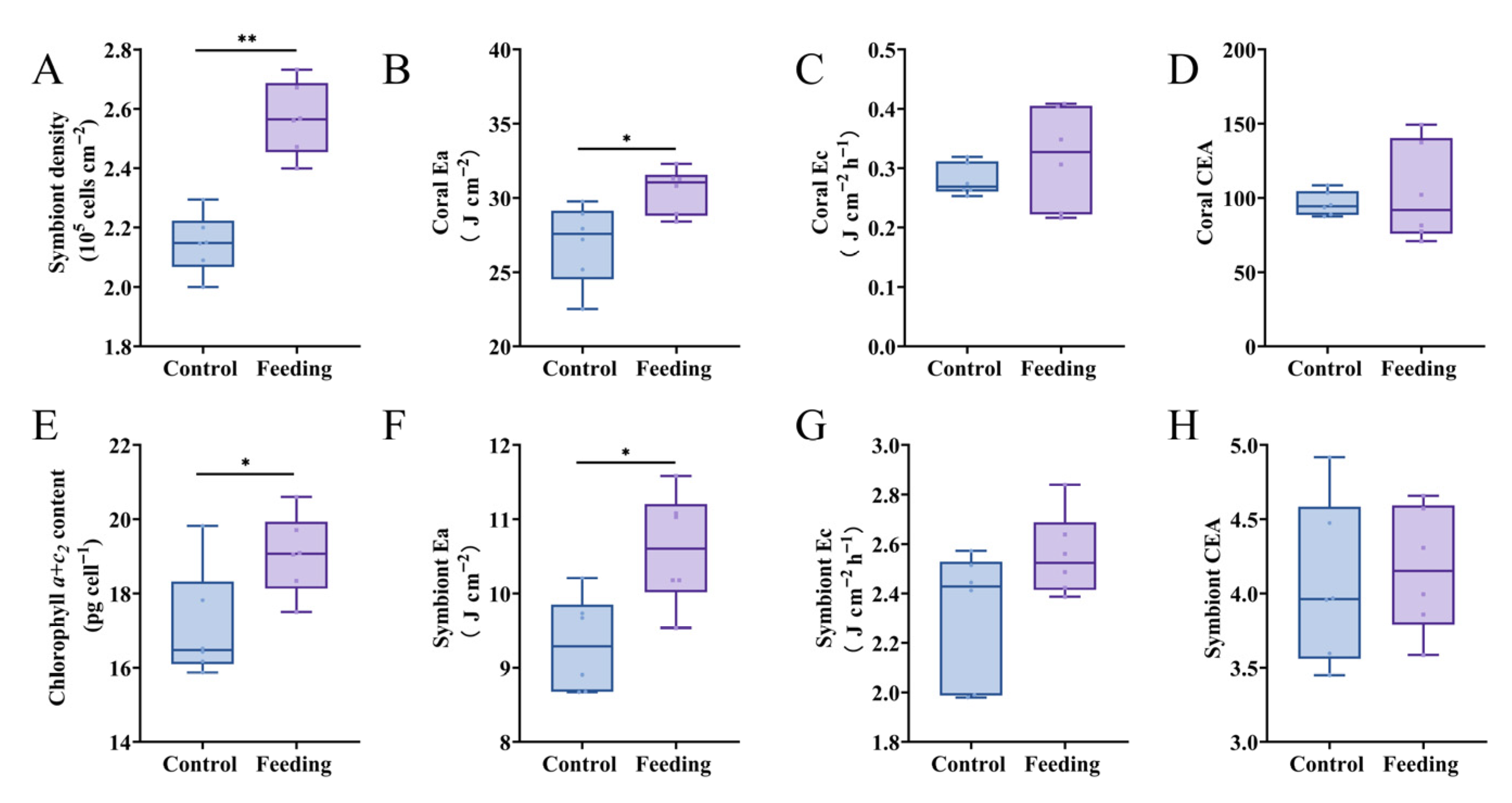 - Huffmyer, A.S.; Johnson, C.J.; Epps, A.M.; Lemus, J.D.; Gates, R.D. Feeding and thermal conditioning enhance coral temperature tolerance in juvenile Pocillopora acuta. R. Soc. Open Sci. 2021, 8, 210644. [Google Scholar] [CrossRef] [PubMed]