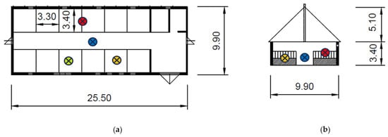 The masonry building of the stable has a gable tin roof. Details were described in [109]. The location of the measurement points is shown in Figure 1. Figure 2 shows the exterior and interior views of the stable. At the time of the research measurements, 12 horses were housed in the stable.