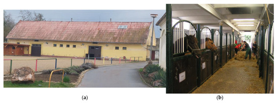 A prerequisite for the successful provision of education and other sports or recreational activities related to horse breeding is the provision of suitable stable accommodation for horses [3,4,5] and the provision of suitable equipment and an environment for students and other people actively involved in the operation of the stable [6,7]. The priority for the construction of a horse stable is to provide suitable accommodation for horses at a level corresponding to the requirements of animal welfare [8,9,10,11]. However, attention should also be paid to the conditions for staff (caretakers, teachers, trainers) and students.