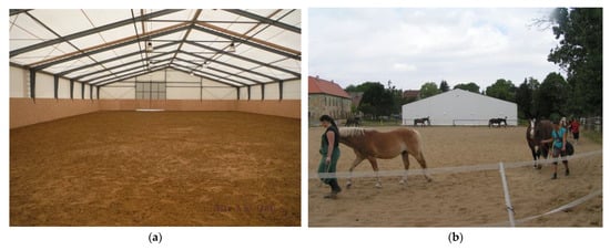 The indoor riding arena (Figure 3 and Figure 4a) was described in detail in [109]. The outdoor riding arena (Figure 4b–d) has dimensions of 48 m by 32 m, and the surface is sandy.