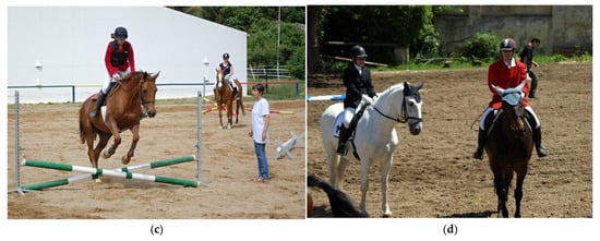 The riding arenas: (a) the interior of the indoor riding arena with a modified floor surface. (b,c) Students training in an outdoor riding arena. An indoor riding arena is in the background. (d) Riders before the competition.