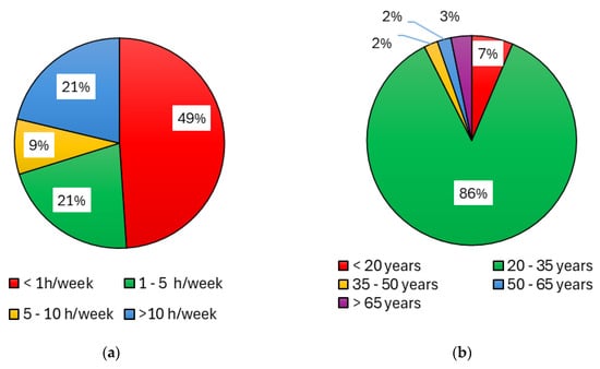 Given the importance of the investigated impact of dust on the health of workers, an anonymous survey “Questionnaire: dust in stables/riding stables—impact on health” [114] was also prepared. In this questionnaire, people staying in the stable and its surroundings (workers, students, and members of the riding club) expressed their subjective experiences with the impact of dust in the environment in the horse stable or riding arena and their personal health/respiratory/allergic problems. A total of 94 respondents participated in this anonymous questionnaire survey [114] during the semester. The percentage representation of the various categories is shown in Figure 5 and Figure 6.