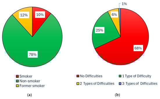 Possible previous influence on the occurrence of subjective respiratory problems—Percentage structure of the questionnaire respondent group depending on: (a) Smoking; (b) Previous medical history connected with respiratory diseases—difficulties such as allergies, asthma, chronic obstructive pulmonary disease, and their combinations.