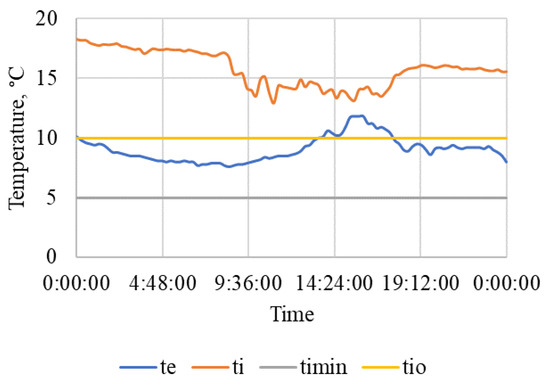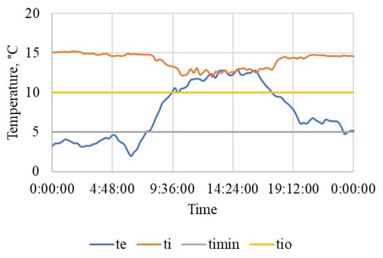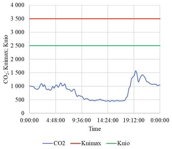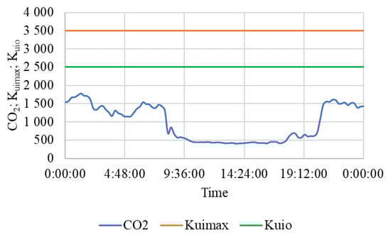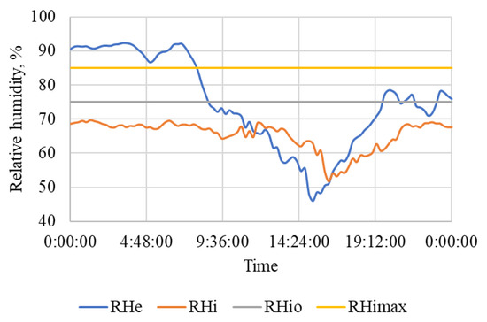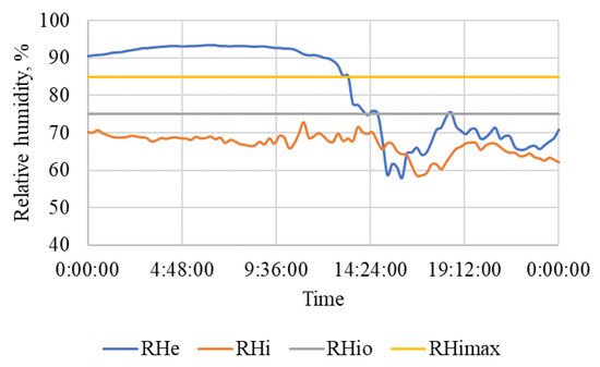 In [28] the following were listed: lower limit of the temperature optimum tio = 10 °C, the lowest permissible temperature timin = 5 °C, upper limit of optimal relative humidity RHio = 75%, the highest permissible relative humidity RHimax = 85%, the limit of the optimal range of CO2 concentration in a stable for horses Kuio = 2500 ppm, and the permissible concentration of CO2 in a stable for horses Kuimax = 3500 ppm.