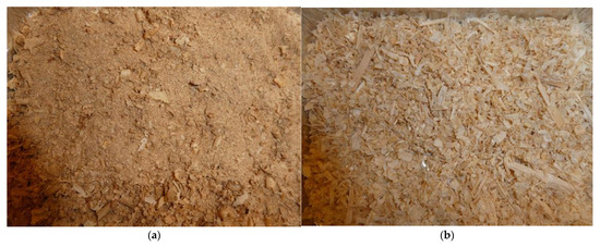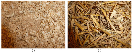 Another frequently used type of bedding is wood sawdust and shavings, or a mixture of them. The advantages are high absorbency [95], low losses, easy handling and storage of packaged products, and minimal fungal spores [96]. The disadvantages of packaged products are a higher price, higher dustiness, poorer storage stability of unpackaged products, and possible impurities (varnishes, nails, etc.). Compared to straw, they have worse thermal insulation properties.
