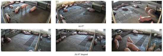 The dataset utilized in this study was collected from a large-scale commercial pig farm located in Linfen City, Shanxi Province. The pig house features an enclosed structure where pigs at different growth stages are physically separated by railings. The flooring is constructed with concrete and textured cement panels, providing both ventilation and liquid drainage capabilities. Video data were acquired using six Hikvision cameras (Hangzhou, China) strategically installed at various locations within the facility. All cameras were configured to record at a resolution of 1920 × 1080 pixels (1080p) and a frame rate of 25 fps. Each camera was mounted approximately 1.7 m above the ground, an optimal height and angle for obtaining comprehensive and clear footage of the pigs. Data collection was conducted over a two-month period from August to October 2022, yielding approximately 2 TB of raw video data. An obtained dataset sample is shown in Figure 1.