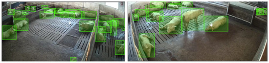 The selected images were annotated using the Make Sense.ai online annotation tool (https://www.makesense.ai/). The annotation process was conducted by two annotators. To ensure consistency and accuracy, all annotations were cross-validated, meaning that each annotation created by one annotator was reviewed and verified by the other. As this study focuses solely on pig detection, a single class label, “pig”, was used for all bounding boxes. The bounding boxes were stored in the YOLO format, where each annotation in the TXT files contains the values <class_id>, <x_center>, <y_center>, <width>, and <height>, with all coordinates being normalized relative to the image dimensions. The annotations from the TXT files were subsequently converted into a structured JSON format for ease of use. The final JSON format follows the standard COCO dataset schema, containing keys for “images”, “annotations”, and “categories”. In this COCO-compliant JSON, the bounding box for each object is stored as a list [x_min, y_min, width, height], where the coordinates (x_min, y_min) are the absolute pixel values of the top-left corner of the bounding box, and width and height are the absolute dimensions in pixels. Some annotation examples are shown in Figure 2.