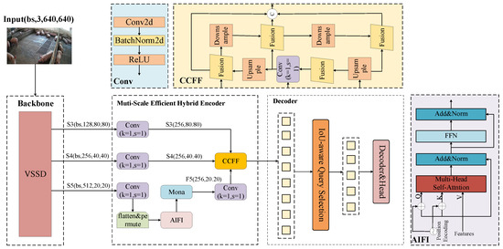 The overall architecture of the proposed pig detection model, VM-RTDETR, is illustrated in Figure 4. It consists of three main components: a feature extraction backbone, a Multi-Scale Efficient Hybrid Encoder (M-Encoder), and a decoder with a prediction head. The core innovations include the introduction of a VSSD [22] module into the feature extraction backbone and the novel design of the Multi-Scale Efficient Hybrid Encoder (M-Encoder). These enhancements effectively address the limitations of existing models in capturing global features and extracting rich multi-scale representations under complex farming environments.