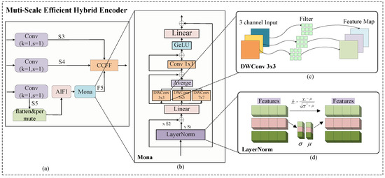 The architecture of the Multi-Scale Efficient Hybrid Encoder module M-Encoder. Here, (a) is the architecture of the Multi-Scale Efficient Hybrid Encoder M-Encoder we proposed, where the outputs of the three parallel depth-wise convolutional branches are fused using an element-wise average operation. (b) is the core module Mona [26] in the M-Encoder, used for multi-scale feature extraction. (c) is the detailed structure diagram of DWConv 3 × 3 . (d) is the detailed part of LayerNorm.