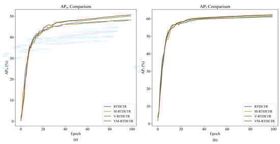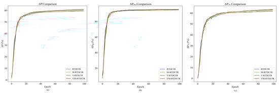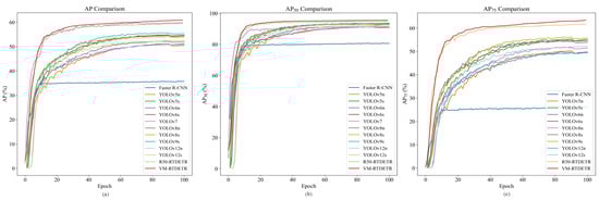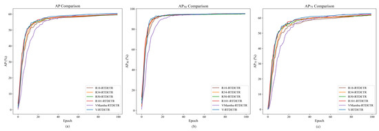 As shown in Figure 7a, the curve of VM-RTDETR not only converges to the highest value but also exhibits a faster and more stable rise compared to other models. Similarly, its curve in Figure 7b maintains a clear leading advantage, indicating robust localization capability from the early stages. Most notably, the curve in Figure 7c shows a substantial performance gap, especially in later epochs, underscoring the model’s enhanced capability for high-precision bounding box regression under stringent thresholds.