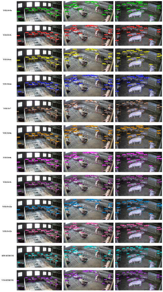 The superior performance of VM-RTDETR can be attributed to its synergistic architectural design. First, the VSSD backbone, empowered by the NC-SSD mechanism, breaks through the causal constraints of traditional state-space models. This enables efficient modeling of long-range dependencies and significantly enhances the extraction of global structural features from the image. Second, the M-Encoder tackles the challenge of scale variation by replacing single-scale processing with a parallel architecture employing 3 × 3, 5 × 5, and 7 × 7 convolutional kernels. This design simultaneously captures fine-grained details (via 3 × 3 kernels), intermediate contours (via 5 × 5 kernels), and broader spatial contexts (via 7 × 7 kernels). The subsequent fusion of these multi-scale features constructs a comprehensive hierarchical representation. Consequently, through the synergistic optimization of the VSSD backbone and M-Encoder, VM-RTDETR demonstrates stronger robustness and higher detection accuracy in complex scenarios (such as occlusion and lighting variations), providing an efficient and precise solution for automated pig detection.