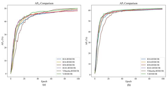 Comparison curves of and values between R18-RTDETR, R34-RTDETR, R50-RTDETR, R101-RTDETR, VMamba-RTDETR, and V-RTDETR models.