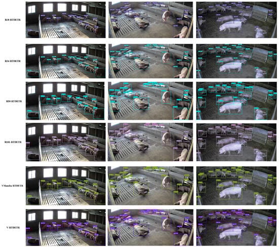 Figure 16 compares the detection boxes and detection accuracy of four models, RTDETR-R50, M-RTDETR, RTDETR-VSSD, and VM-RTDETR. As clearly shown in the first column of images, VM-RTDETR successfully detected pigs in the upper-left area that were missed by RTDETR-R50, while achieving higher detection accuracy compared to other models. In the second column, the original model failed to detect the seven overlapping pigs at the top, whereas VM-RTDETR accurately identified all pigs under occlusion. In the third column, VM-RTDETR detected the top pig under challenging lighting conditions, while other models failed, demonstrating superior detection accuracy and significantly reducing the missed detection rate. These comparative results visually corroborate the quantitative performance gains reported in Table 2 and Table 5, demonstrating VM-RTDETR’s practical advantages in handling real-world complexities such as occlusion, dense grouping, and lighting variations.