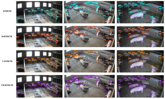 We further compare the bounding box quality and detection accuracy qualitatively in Figure 8. The results demonstrate that VM-RTDETR produces the most precise and complete bounding boxes, indicating a superior ability to localize pig targets and delineate their boundaries accurately in complex scenes.