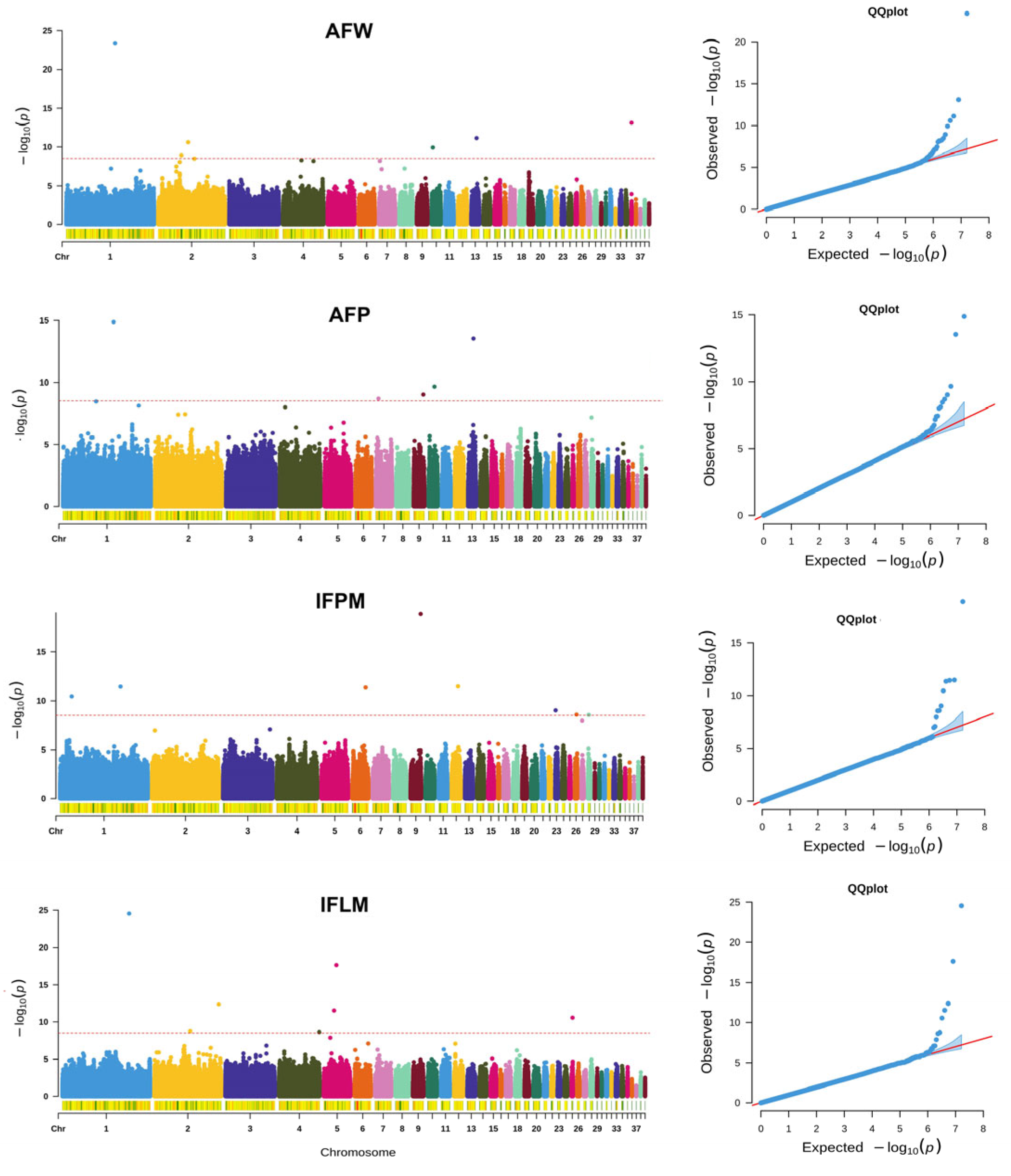 Table 3. Significant SNPs and candidate genes associated with AFW, AFP, IFPM, and IFLM traits.