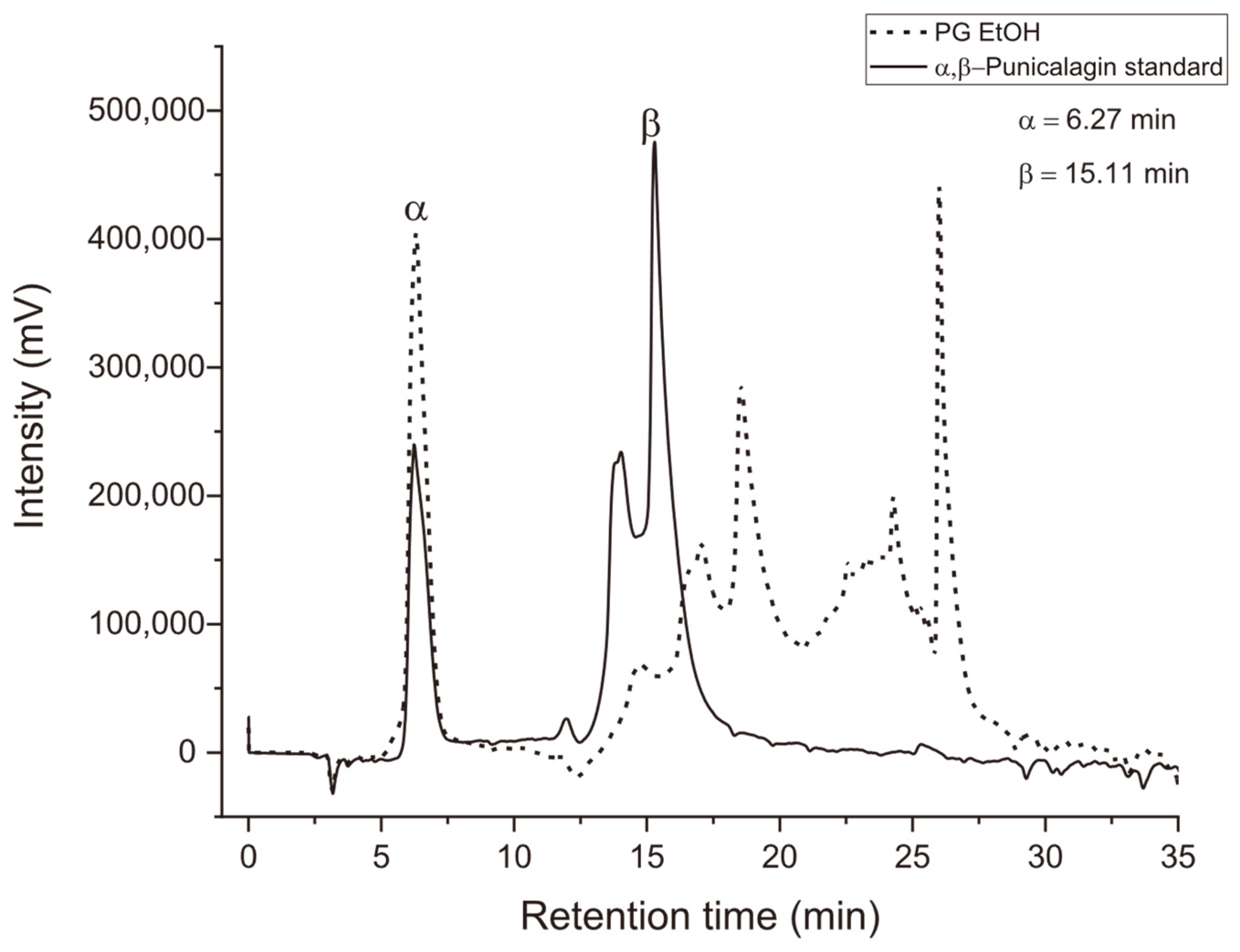 Figure 1. Overlay of HPLC-UV-Vis chromatograms of the ethanolic extract from Punica granatum (EE-PG) (dotted line) and the α- and β-punicalagins standards (solid line), in 254 nm.