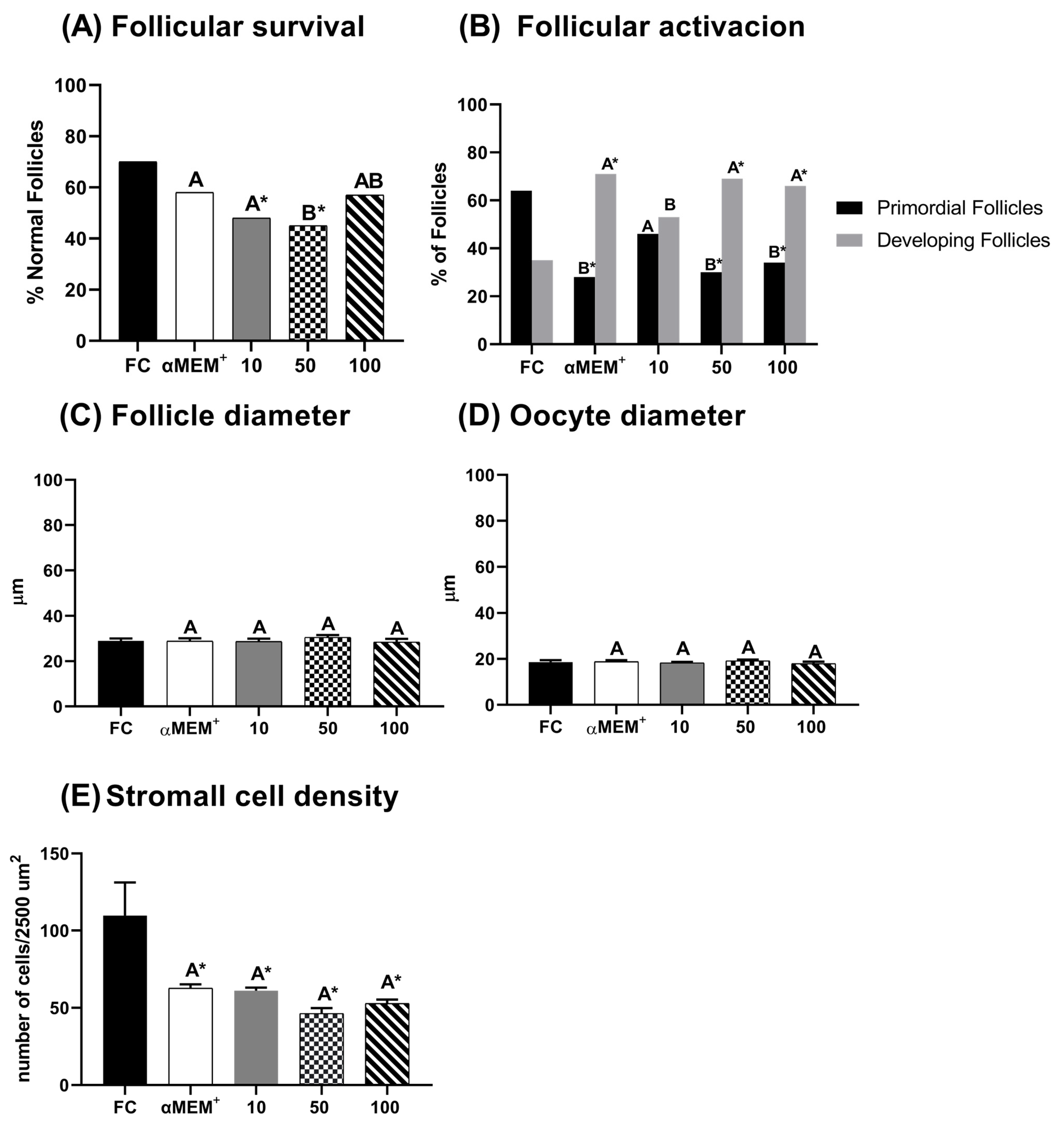 Figure 2. Percentage of morphological normal follicles (A), follicular activation (B), follicle (C) and oocyte (D) diameters, and stroma density area (E) in bovine ovarian tissue before (fresh control, FC) and after 6 days of in vitro culture in the absence (αMEM+) or presence of ethanolic extract from Punica granatum L. (EE-PG) at 10, 50 and 100 µg/mL. A,B Different capital letters denote significant differences among treatments at day 6 of in vitro culture (p < 0.05). * Indicates difference from FC (p < 0.05). The analyses were performed using the chi-squared test (Χ2) (for percentage of normal follicles and follicular activation) and one-way ANOVA followed by Tukey’s post hoc test (for oocyte and follicular diameter and stromal cell density).