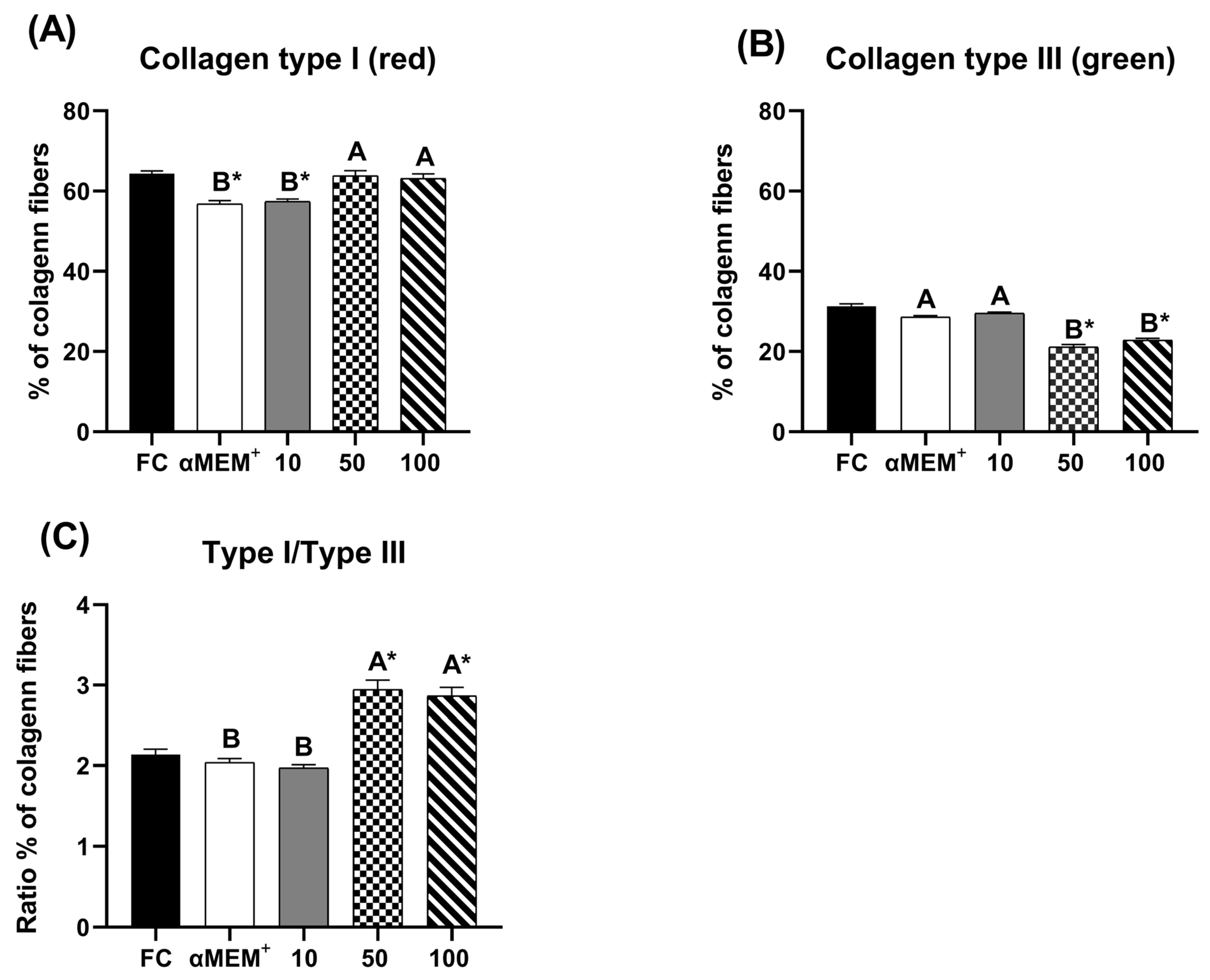 Figure 3. Percentage of pixels for type I (A), type III (B) and the ratio of type I/type III collagen fibers (C) in fresh bovine ovarian tissue (fresh control, FC) or after 6 days of in vitro culture in the absence (αMEM+) or presence of ethanolic extract from Punica granatum L. (EE-PG) at 10, 50 and 100 µg/mL. A,B Different capital letters denote significant differences among treatments at day 6 of in vitro culture (p < 0.05). * Indicates difference from FC (p < 0.05). The analyses were performed using one-way ANOVA followed by Tukey’s post hoc test.
