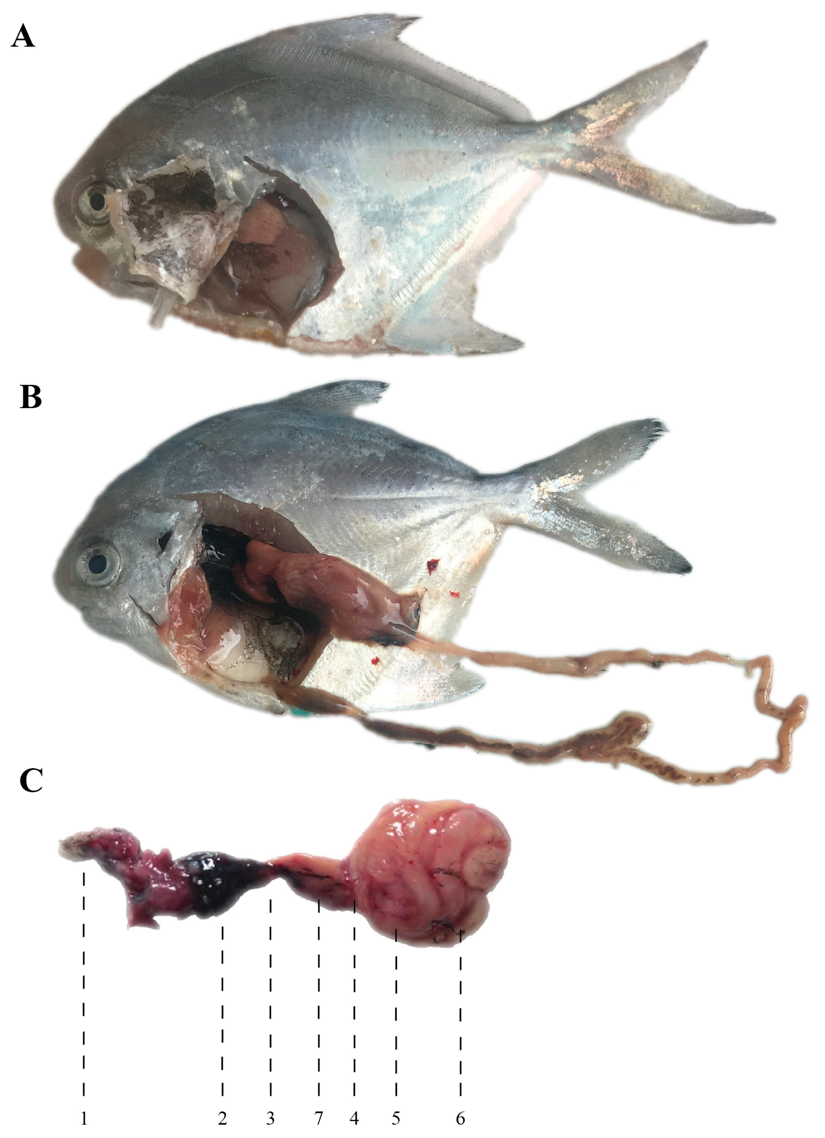 Figure 1. Internal structure of Pampus argenteus. (A,B): anatomical diagrams; (C): digestive systeanatomy [7]. 1: Tongue; 2: Pharyngeal sac; 3: Esophagus; 4: Stomach; 5: Pyloric caeca; 6: Intestine; 7: Liver.