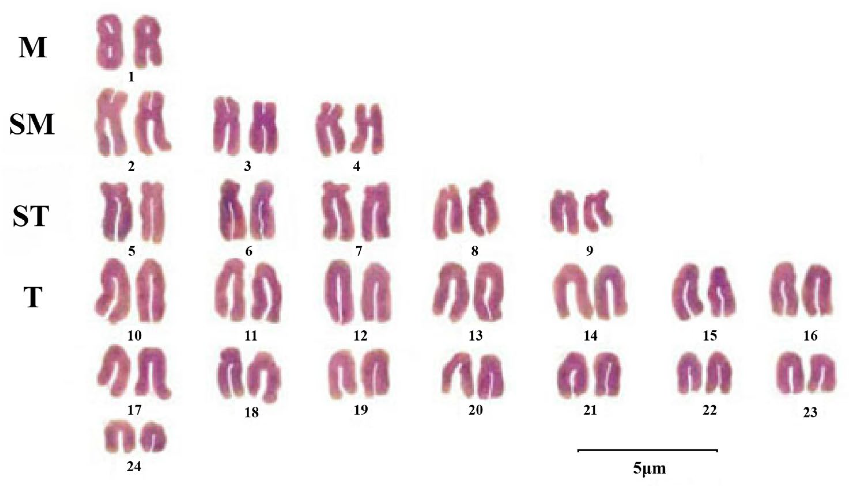 Figure 2. Karyotype of P. argenteus (scale bar = 5 μm) [17]. M: Metacentric; SM: Submetacentric; ST: Subtelocentric; T: Telocentric.