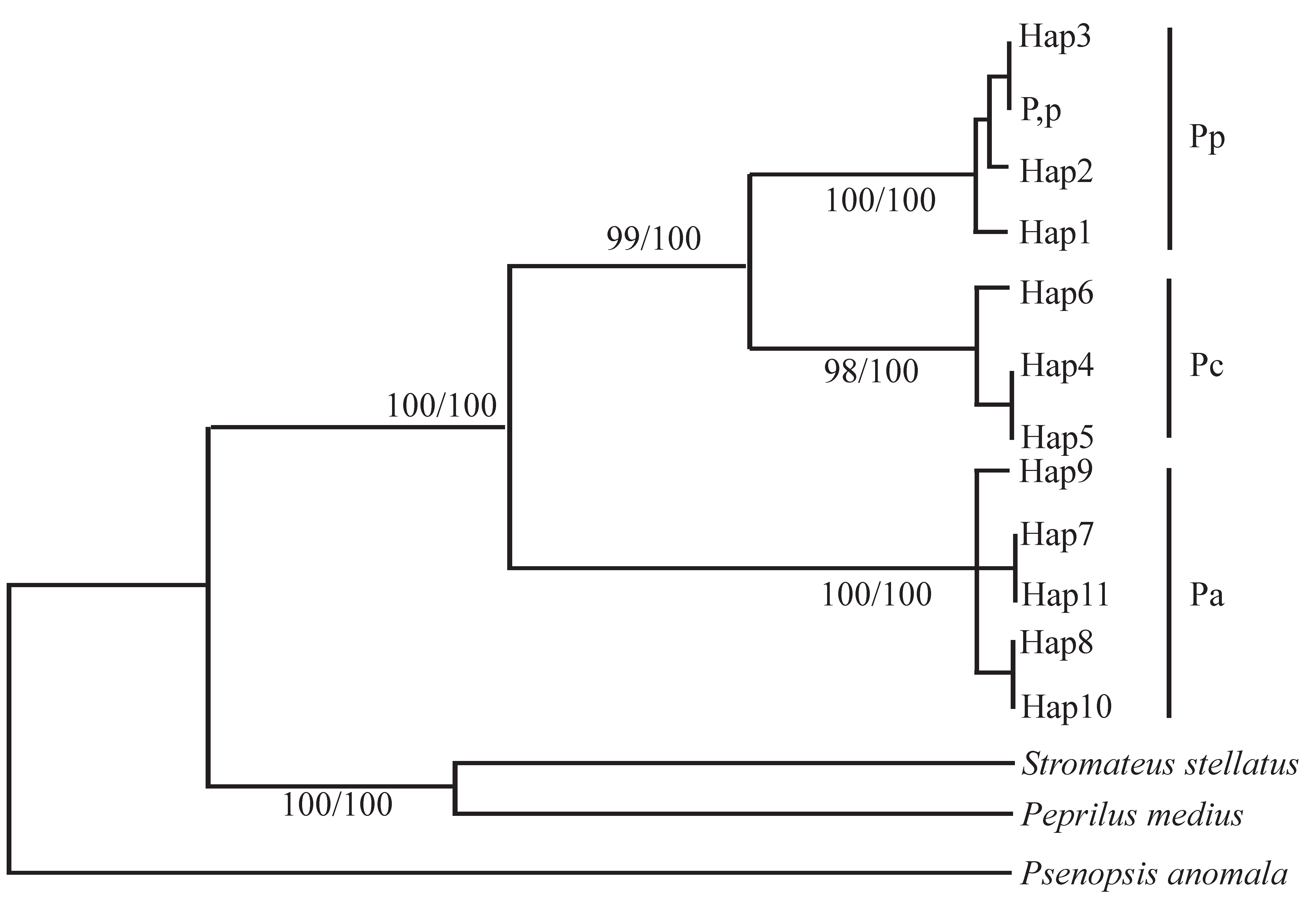Figure 4. Construction of phylogenetic tree in the Pampus genus based on mitochondrial Cyt-b gene fragment (numbers indicate bootstrap confidence values of NJ and ML methods) [22]. Pa: P. argenteus, Pc: P. chinensis, Pp: P. punctatissimus, Hap: haplotype.