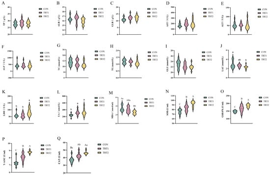 Serum biochemical indices were determined using commercial colorimetric assay kits. The analyzed parameters included total protein (TP), albumin (ALB), globulin (GLB), aspartate aminotransferase (AST), alanine aminotransferase (ALT), alkaline phosphatase (ALP), uric acid (UA), total cholesterol (TC), triglycerides (TG), glucose (GLU), lactate (LAC), and lactate dehydrogenase (LDH). Antioxidant-related parameters in serum included malondialdehyde (MDA), superoxide dismutase (SOD), glutathione peroxidase (GSH-Px), total antioxidant capacity (T-AOC), and catalase (CAT). All assays were performed following the manufacturer’s instructions using commercial kits purchased from Nanjing Jiancheng Bioengineering Institute (Jiangsu, China).
