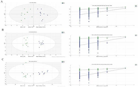 OPLS-DA score plots (left) and corresponding validation plots (right) for pairwise comparisons. (A–C) Between the CON vs. TRT1, CON vs. TRT2, and TRT1 vs. TRT2 comparisons, respectively. Abbreviation: OPLS-DA, Orthogonal Projection of Latent Structures Discriminant Analysis (n = 10).